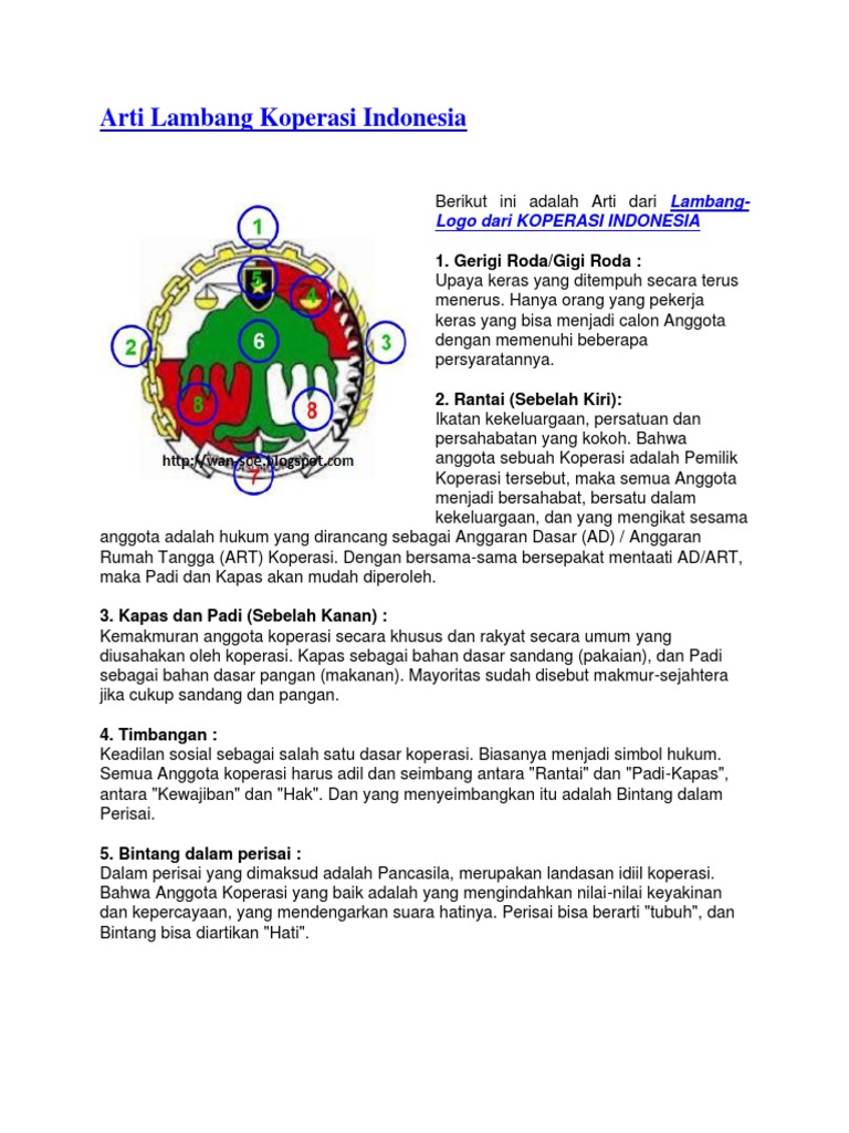 Pelayanan Dan Manfaat Koperasi Merupakan gerakan ekonomi rakyat yang bertujuan untuk meningkatkan kesejahteraan masyarakat dengan melandaskan kegiataannya pada prinsip-prinsip Koperasi. Lambang Koperasi terdiri dari gambar rantai gigi roda kapas dan padi timbangan bintang dan perisai pohon beringin tulisan Koperasi Indonesia dan warna merah putih. Padi merupakan representasi dari kebutuhan pangan sedangkan kapas adalah simbol kebutuhan dasar sandang.